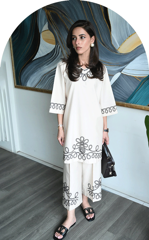 Ivory White Ensemble with Intricate Black Threadwork Square Neck Kurta Set D6323