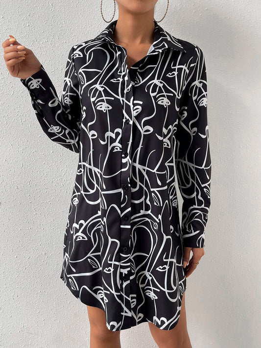 Allover Print Button Front Shirt Dress Without Belt D1904