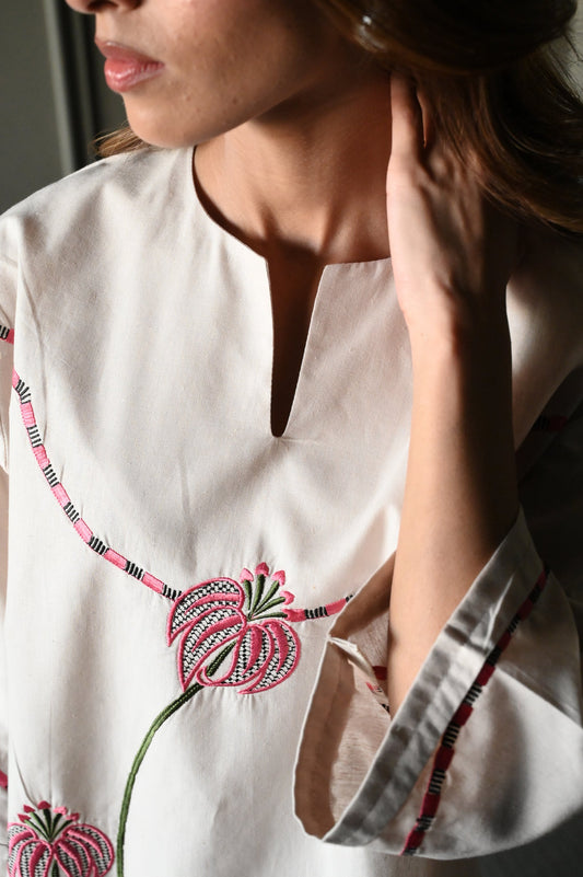 Ivory Cotton Co-Ord Set with Multicolor Floral Embroidery D6286