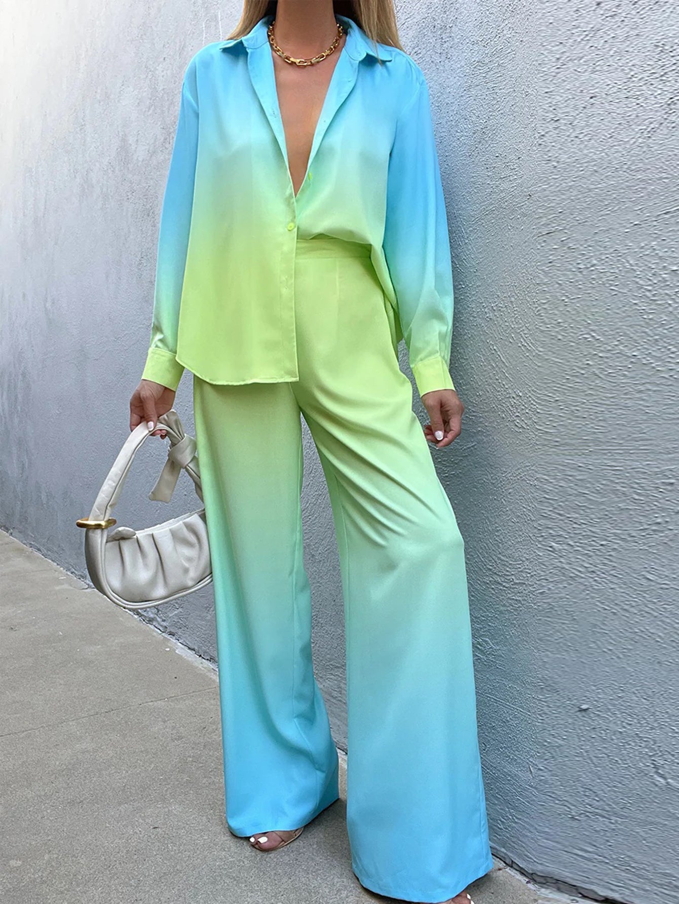 Multi Colour Bemberg Satin Shirt With Print And Buttoned Cuffs. Comes With High-Waisted Pant With Side Pockets.