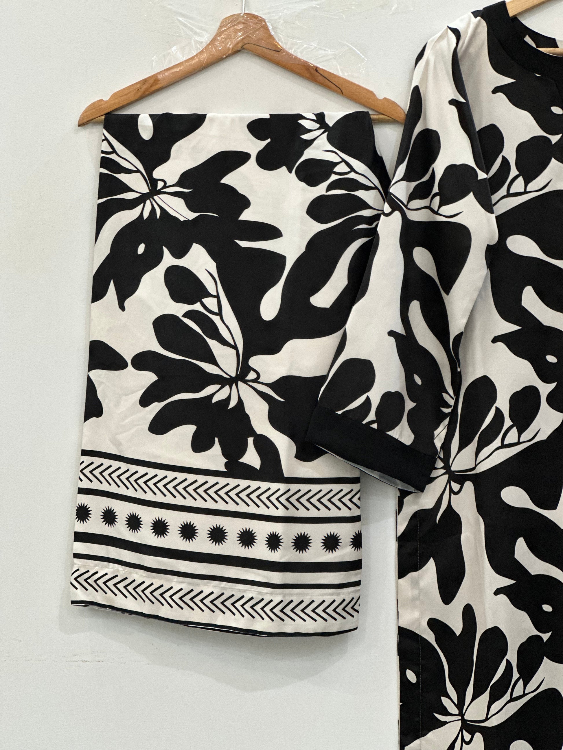 Black & White Flower Printed Armani Satin Suit set D6061 - kharidari