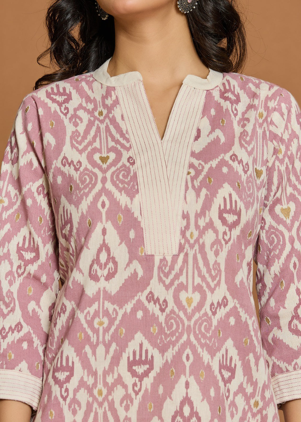 Stay stylish and comfortable in this pure cotton Ikkat printed co-ord set. Perfect for casual outings, it blends traditional charm with a modern silhouette.