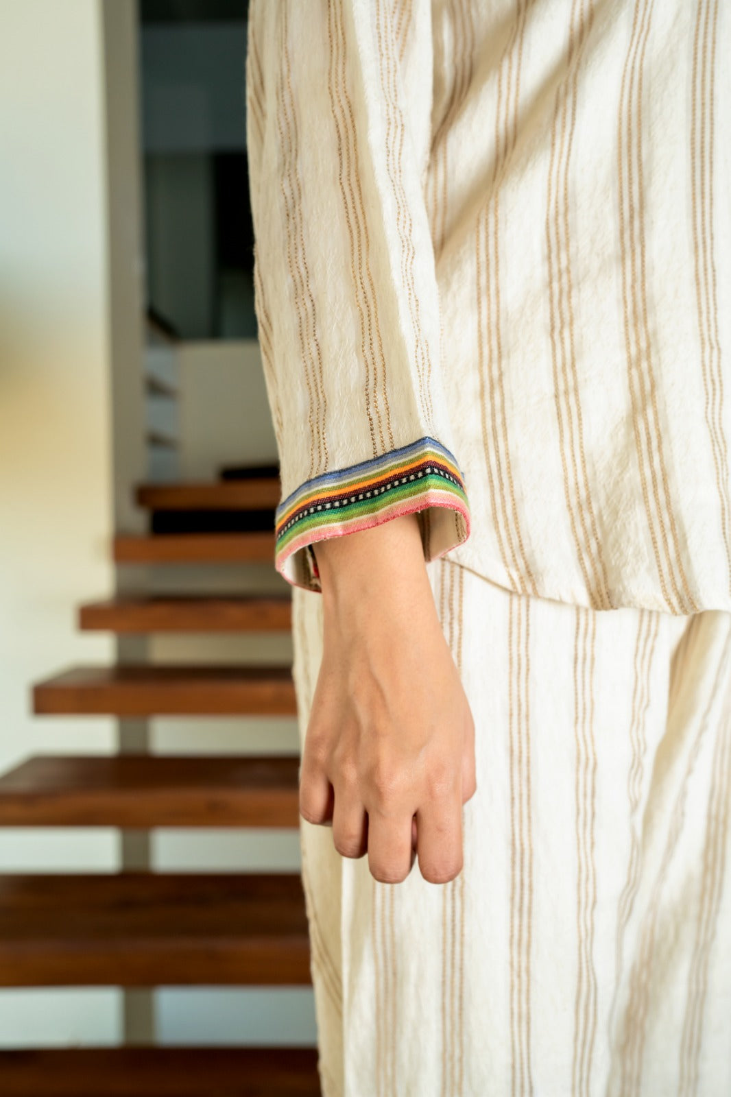 Crafted in soft, breathable fabric, this elegant beige striped Premium look shirt & pants co-ord set brings comfort and style together. The shirt features delicate multicolor on the front placket and cuffs, paired with matching striped straight-fit pants for a coordinated and chic look. Perfect for casual outings, festive gatherings, or travel wear, this versatile outfit offers effortless elegance for any occasion.
