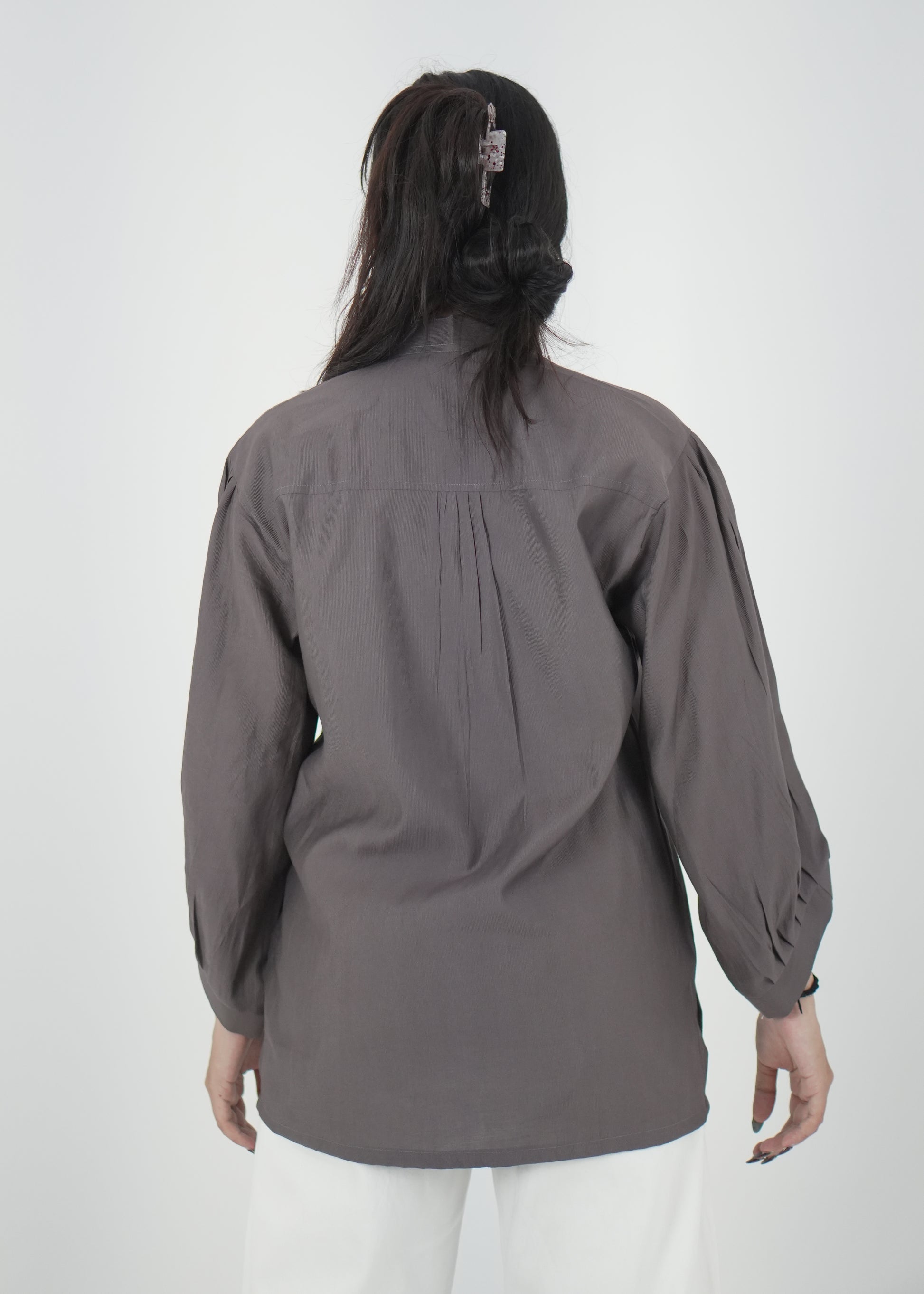 Sophisticated grey denting fabric shirt with a mandarin collar and relaxed fit. Perfect for chic casual wear or office styling.