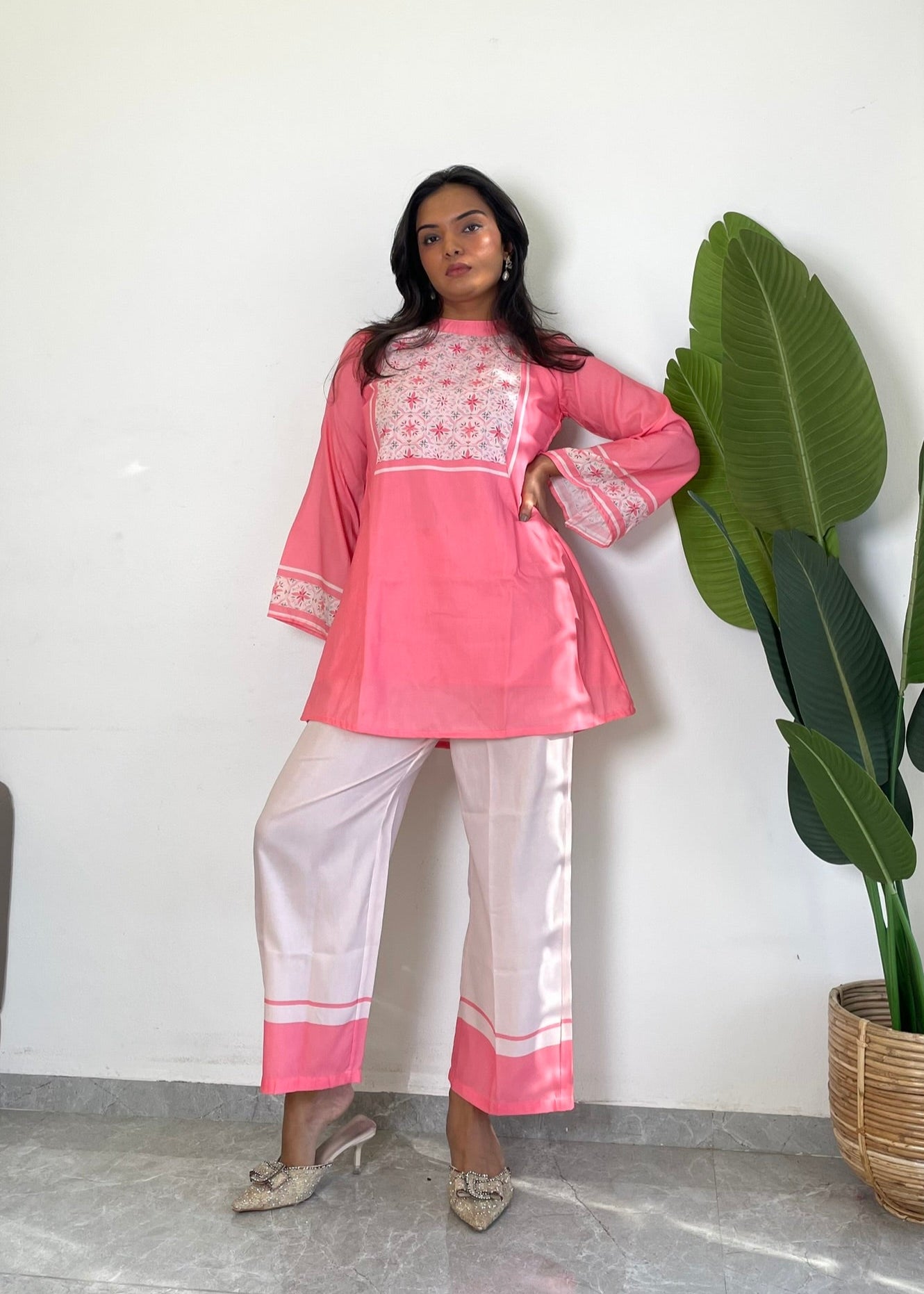 Pink Flower Printed Dual-Color Co-ord Set D6072 - kharidari