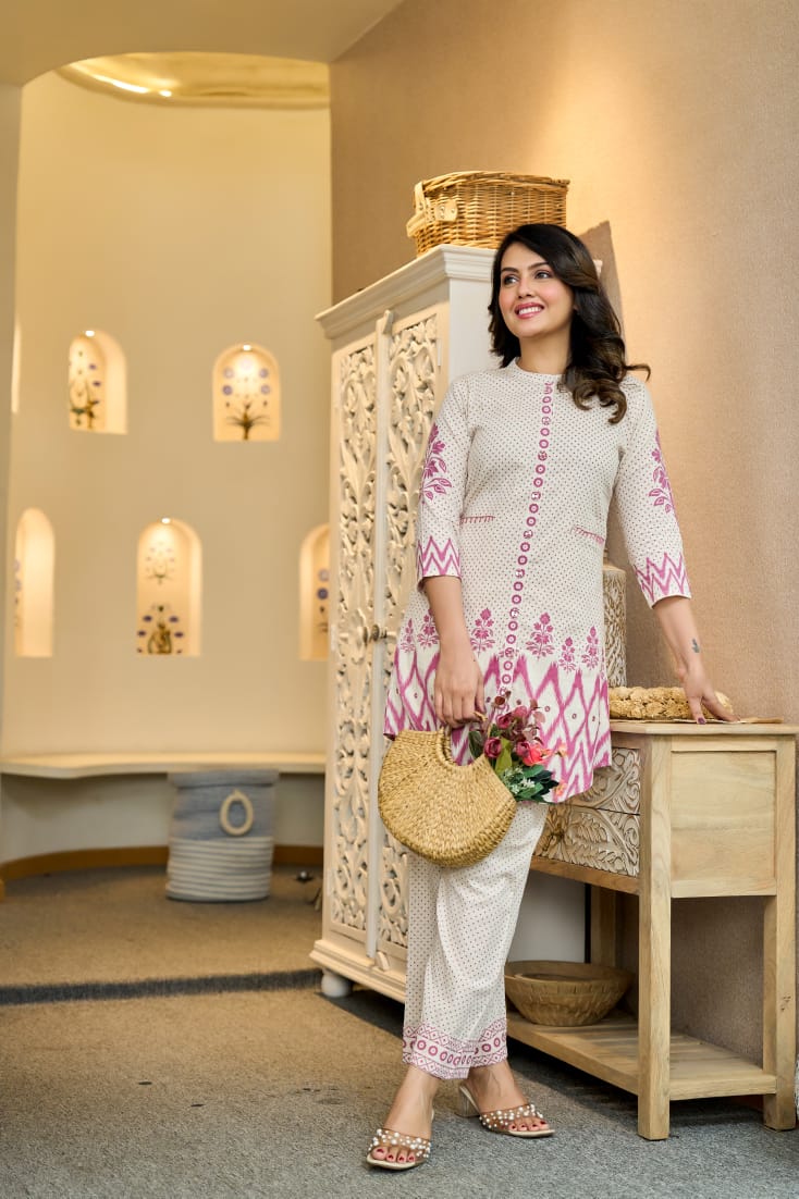 Crafted in pure cotton, this co-ord set blends floral, polka dot, and geometric prints. Features a button-down kurti with 3/4 sleeves and matching bottoms for chic comfort.