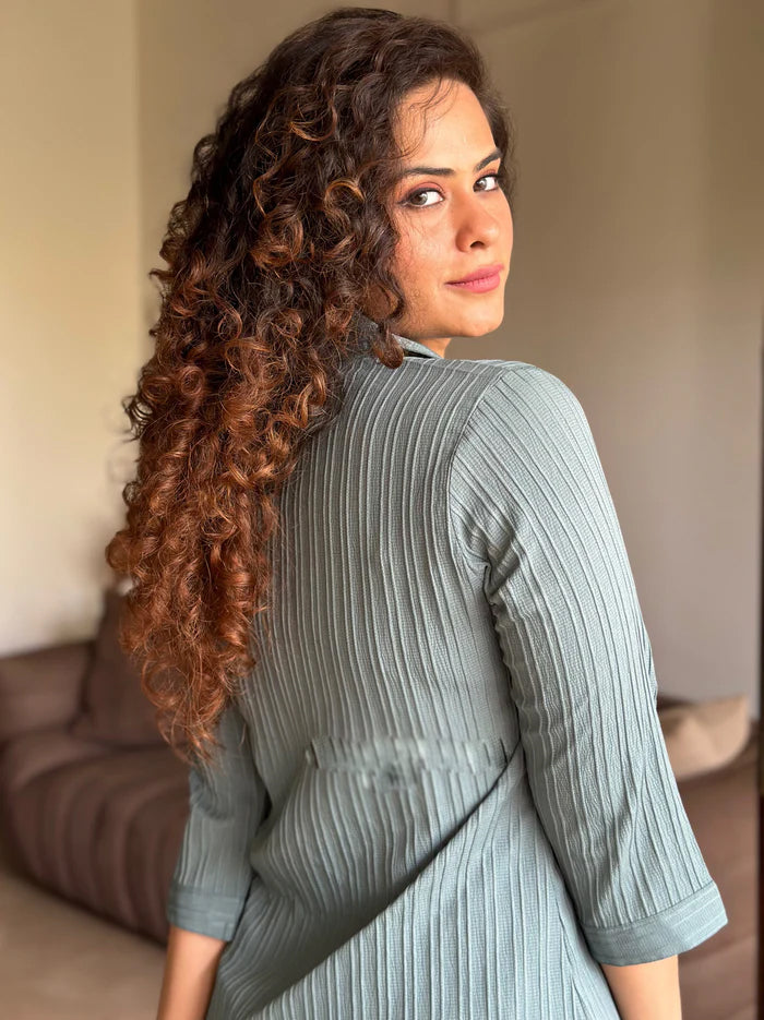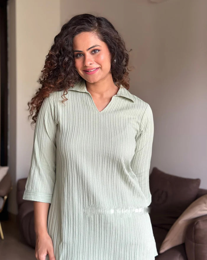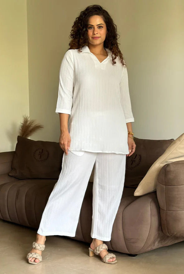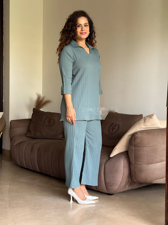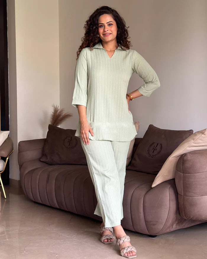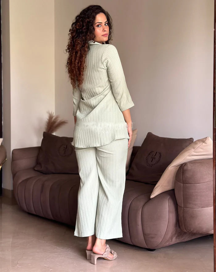 This stunning coord set,crafted from a luxurious textured fabric,is your perfect companion for breezy escapes.No inner layerensures ultimate comfort and breathability,making it ideal for warm weather and resort wear.