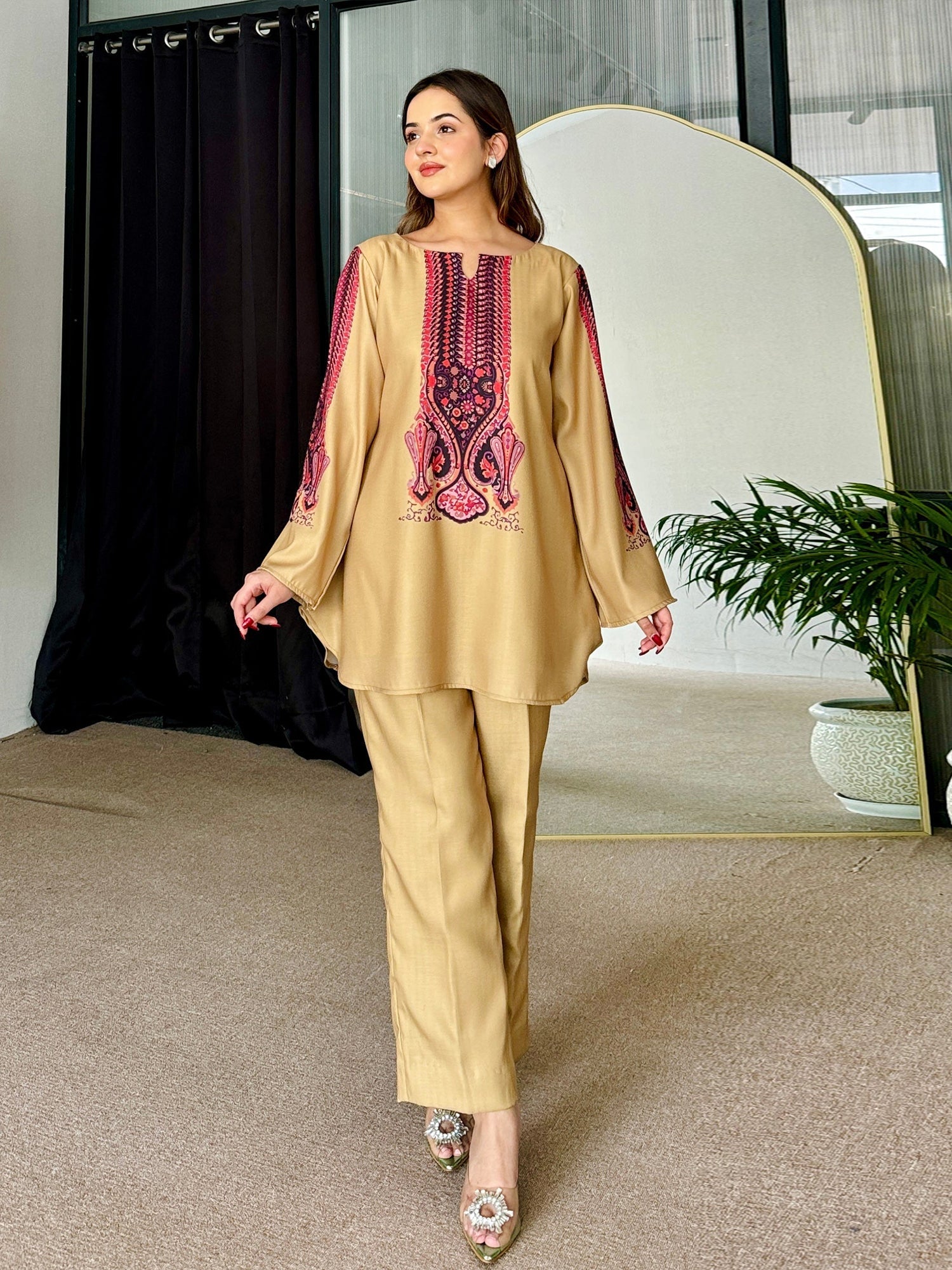Beautiful Sunlit Coord set with intricate print details on neckline and sleeves to enhance look.