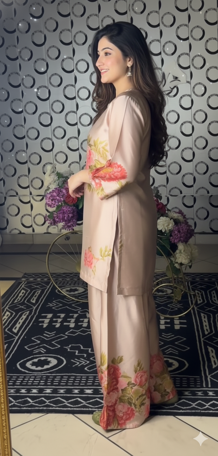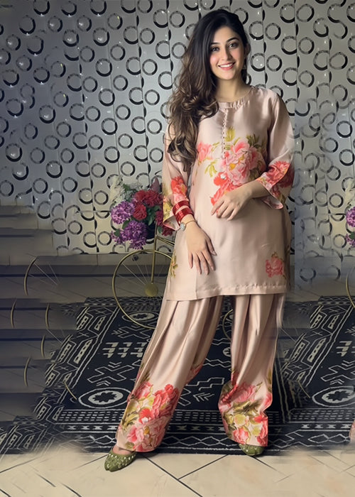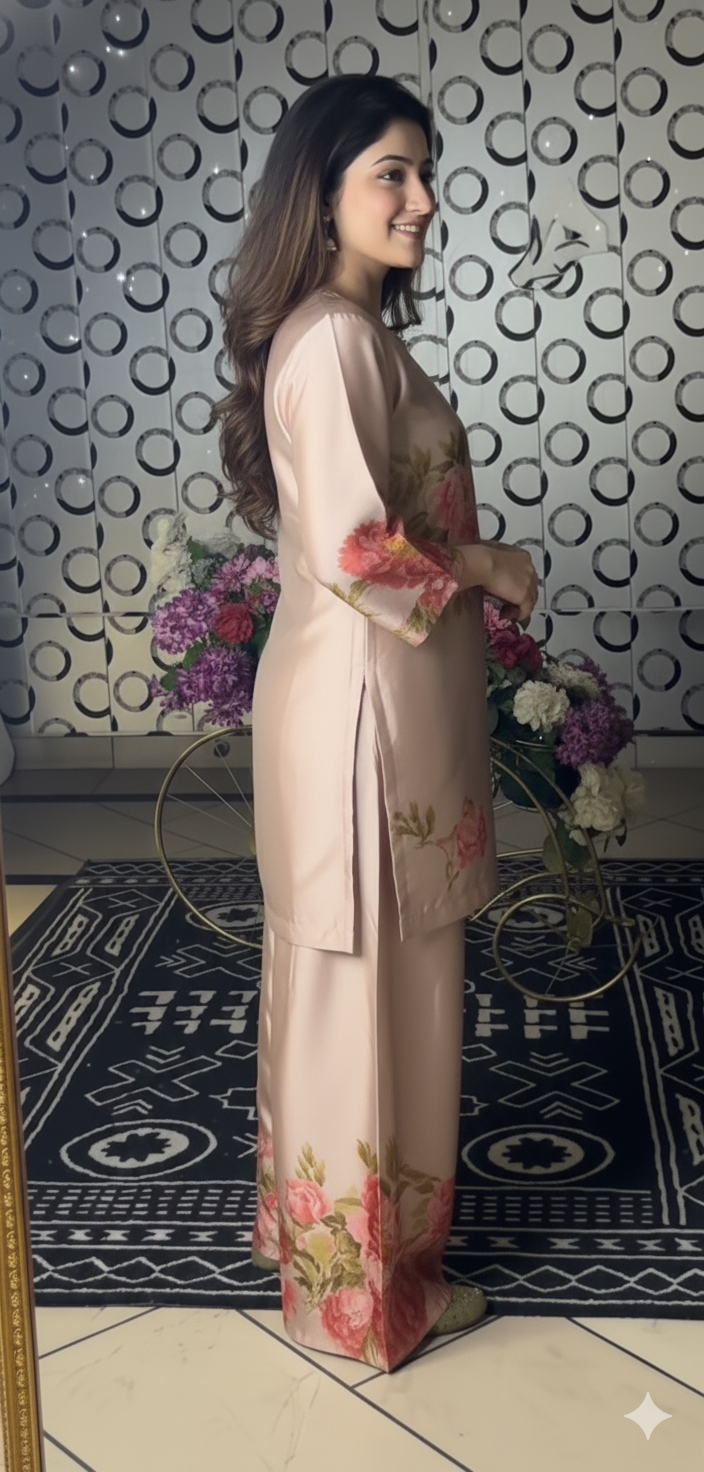The dress is a soft peach-colored traditional outfit featuring delicate floral prints in pink and green tones. It includes a straight kurta with three-quarter sleeves and matching trousers adorned with similar floral patterns, giving it a graceful, feminine, and elegant look.
