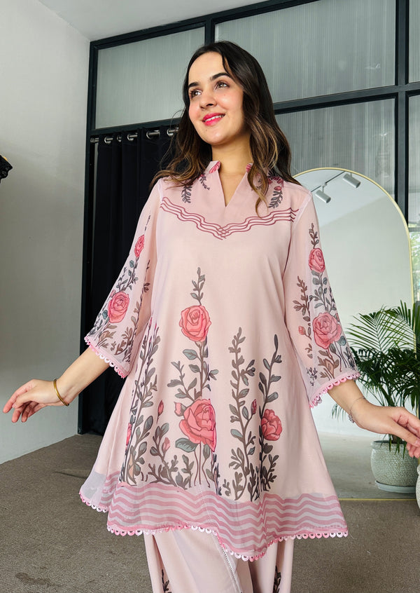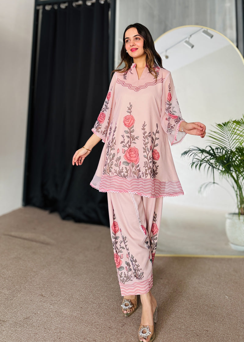 Radiate grace in this charming two-piece outfit crafted from lightweight Georgette fabric, offering a soft drape and breezy feel—perfect for warm weather or daytime occasions. The ensemble features a delicate blush pink base adorned with intricate floral digital prints in soft rose and green tones, creating a fresh and feminine aesthetic.